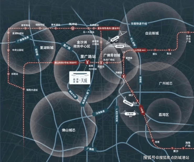 项目地处广佛同城核心桥头堡——金沙洲中芯板块,构建“1电车、2地铁、3高速、4大桥”的多维交通网络。社区内设超2,000㎡公交枢纽,步行约1.5公里可达里水有轨电车梅冲站;未来可便捷接驳广州地铁12号线(里横路站,预计2027年通车)、佛山地铁8号线(岗美站),并快速接入广州环城高速、沈海高速及广佛珠江高速。四大跨江通道——已通车的金沙洲大桥、在建的广佛大桥,以及规划中的沉香大桥、碧江大桥,全面打通至白云、荔湾、千灯湖及珠江新城的通勤动脉,实现约30分钟广佛双城生活圈。