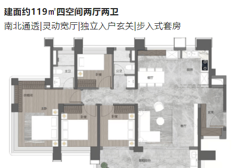 119㎡四房两厅两卫:低区改善户型,南北通透,独立入户玄关;灵动宽厅设计(开间 4.8 米),步入式主卧套间;双阳台分离(生活 + 观景),使用率超 122%,总价 750-780 万,适配二孩家庭。