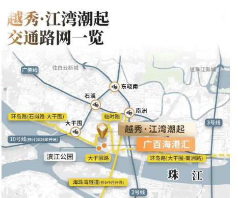 越秀・江湾潮起位于海珠后航道板块,根据《海珠区国土空间总体规划(2021-2035)》,该区域定位为 “珠江后航道高质量发展带”,未来 3 年将投入超 800 亿元推进 20 个重点项目,包括江景岸线改造、旧村更新、商业配套升级等。板块交通枢纽优势显著:10 号线(已开通)串联天河、越秀、海珠、荔湾四大核心区,大干围站 2024 年日均客流量超 5 万人次;海珠湾隧道(2025 年开通)通车后,15 分钟直达广州南站,环岛路(石岗路 - 大干围段)2025 年临时贯通,通行效率提升 40%。