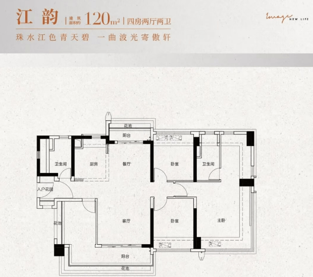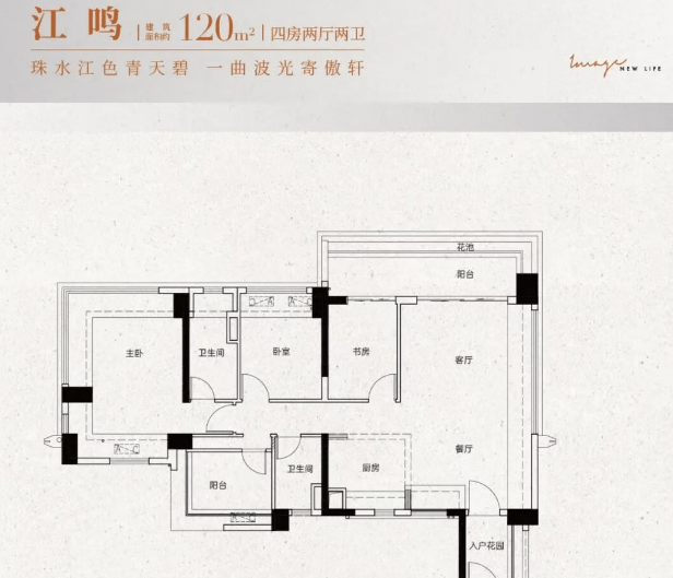 建面约120㎡:四房两厅两卫设计,四开间朝南,居住与生活动静分离,南向大阳台或南北双阳台,主卧带270°飘窗。