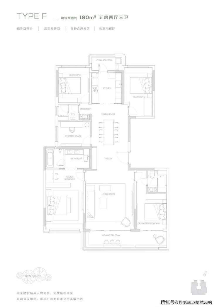 190㎡五房两厅三卫:南向双主卧+中西厨布局,纵向超长LDK一体化空间,适配多孩家庭。总价约1710万元起(认购9折后)。