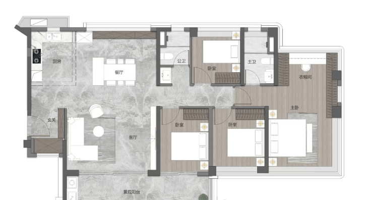 4. 高区户型:160㎡四房两厅三卫(江境),高端改善首选。该户型是高区的主力户型,采用LDK一体化设计,主卧套房配备独立衣帽间与双台盆卫浴,空间尺度开阔,动线规划合理,适合高端改善家庭居住。该户型的空间尺度非常大,居住起来非常舒适,而且配置高端,细节做得非常到位,能满足高端改善家庭的居住需求。LDK一体化设计是这个户型的最大亮点——客厅、餐厅、厨房相连,形成开阔的公共空间,不仅增加了空间的通透感,还能促进家人之间的互动,平时做饭的时候,也能兼顾到客厅里的家人、孩子,非常贴心。而且LDK一体化空间非常宽敞,可根据家庭需求,摆放大型沙发、餐桌等家具,不会显得拥挤,平时招待朋友,也非常有面子。该户型的主卧套房配置非常高端,带独立衣帽间与双台盆卫浴,双台盆卫浴的设计,平时夫妻双方洗漱,不会互相干扰,节省时间;独立衣帽间的空间非常大,能容纳夫妻双方的衣物、鞋子、包包等,收纳能力超强;而且主卧带大飘窗,朝南设计,能享受充足的阳光和良好的江景视野,平时坐在飘窗上,看看江景、喝喝茶,非常惬意。除此之外,该户型还有三个房间,其中一个房间也采用套房设计,带独立卫生间,适合老人居住,私密性强;另外两个房间大小适中,可作为儿童房、书房等,灵活性非常高;双阳台配置,生活阳台与景观阳台分工明确,满足日常使用需求;而且户型南北对流,采光与通风效果俱佳,居住起来非常舒适。