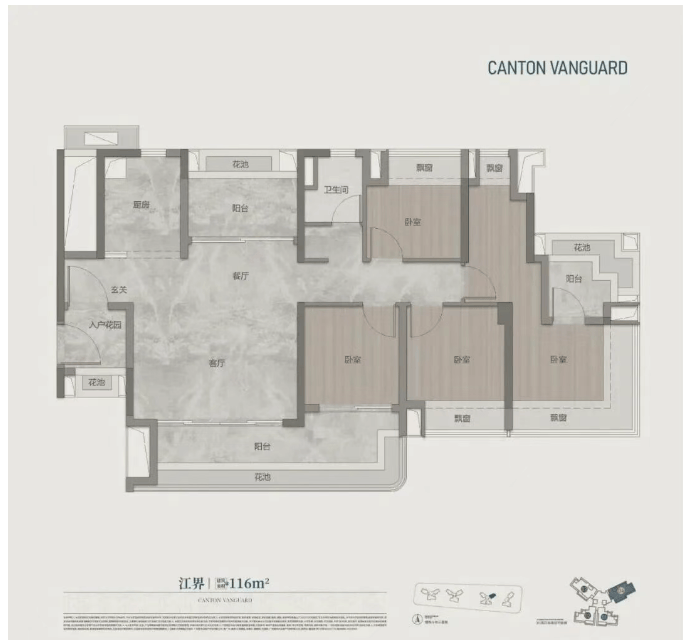 2. 低区户型:116㎡四房两厅两卫(江界),多人口家庭首选。该户型延续了高使用率的优势,综合使用率同样超120%,主打双阳台配置,兼顾功能实用性与居住舒适度,能很好地满足多人口家庭的居住需求。该户型的空间尺度比95㎡户型更大,居住起来更加舒适,适合四口之家、五口之家居住。双阳台配置是这个户型的最大亮点——一个生活阳台,一个景观阳台,分工明确,互不干扰。生活阳台连接厨房,平时可以用来晾晒衣物、存放杂物,保持客厅、餐厅的整洁;景观阳台朝南,视野开阔,平时可以用来休闲、观景,在家就能欣赏到滨江公园的美景,部分朝南单位还能看到江景,居住体验非常好。该户型的客厅采用大开间设计,宽敞明亮,与餐厅相连,形成开阔的公共空间,平时家人聚会、招待朋友,都非常有面子;四个房间均朝南,采光与通风效果俱佳,其中主卧采用套房设计,带独立卫生间和衣帽间,私密性与舒适度兼顾,平时休息、洗漱,都不会受到干扰;另外三个房间大小适中,可根据家庭需求,改造成儿童房、老人房、书房等,灵活性非常高。对于多人口家庭来说,这个户型真的太合适了——双阳台配置,满足日常使用需求;大四房设计,每个人都有自己的独立空间;高使用率,空间不浪费,居住起来非常舒适,性价比非常高。
