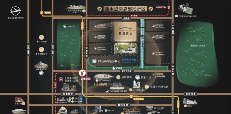 国贸云上地处嘉禾望岗板块,距离地铁2号线、3号线和14号线嘉禾望岗站约500米,形成多轨交汇的立体交通体系,快速连接白云机场、珠江新城及各大CBD区域。门口空港大道作为白云区南北中轴线,串联白云新城总部集聚区、广州设计之都及临空产业区,实现高效出行与区域衔接。项目地理优势明显,自驾出行至天河、海珠等核心区域仅需约30至35分钟,通勤便利。