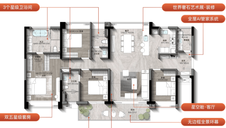 180㎡大平层:双主套设计,7.4米宽景阳台,南向4.5开间,总价约1500万元起(仅60套)。