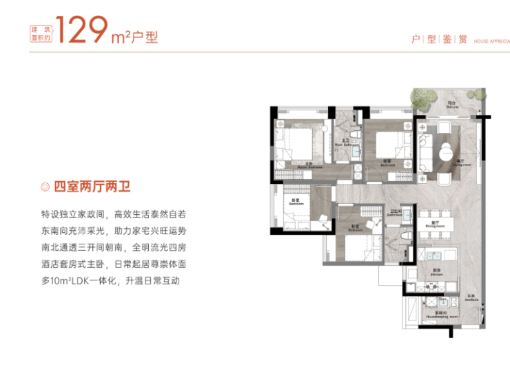 129㎡四房:LDK一体化设计,竖厅布局,入户花园可改家政房,总价约767万元起。