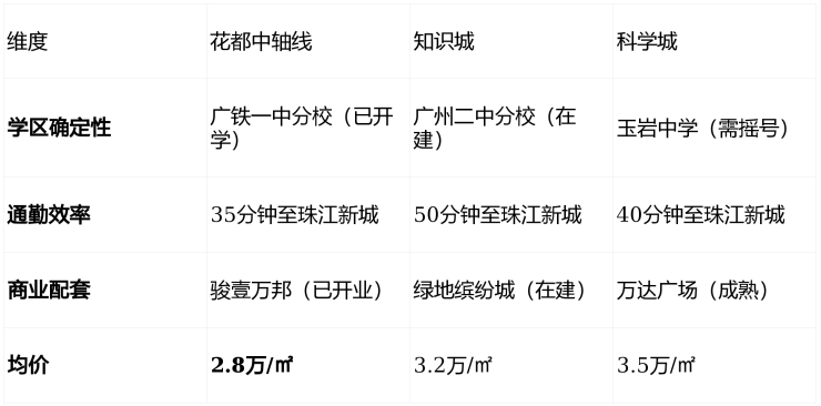 H3:2. 中观对比:花都中轴线VS其他新区,谁更稳?我们以“居住幸福度系数”为评价体系(学区30%+通勤25%+商业15%+产品力20%+性价比10%),对比花都中轴线与知识城、科学城: