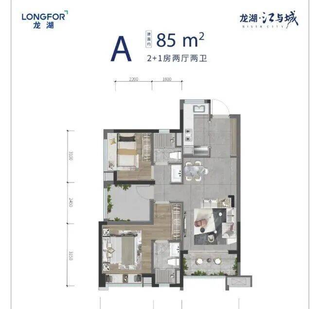 龙湖・江与城提供多种户型供购房者选择,其中85平方米三房两厅两卫户型尤为突出,客厅开间达3.4米,动静分区合理,全南向设计保证了充足的采光通风,还配备了主套,增加了居住私密性。95平方米大三房户型则更加宽敞,客厅开间扩大至3.65米,适合大家庭使用。114平方米四房户型南北对流双阳台,得房率接近80%,性价比极高。而122平方米的大四房户型进一步提升了居住的奢适感,非常适合追求高品质生活的家庭。