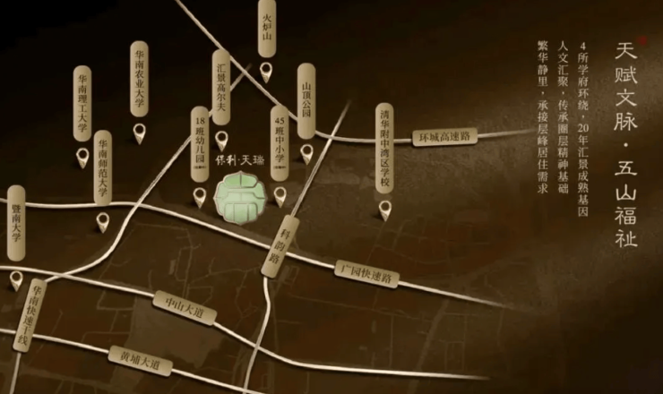 自建 18 班幼儿园和 45 班九年制中小学,已官宣引入广东实验中学教育集团办学,由广东实验中学派出团队管理。周边 211 高校云集,省一级教育资源丰富,为孩子提供一站式优质教育。