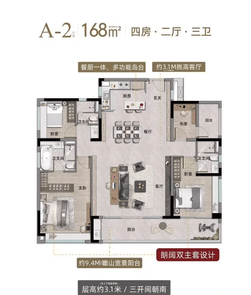 项目主推 97-168㎡三至四房,全户型设计贴合改善需求,高得房率 + 大阳台 + 山景视野是核心亮点:97㎡3+1 房(三开间朝东南,6.1 米大阳台,梅花岭一线山景,得房率 96%),适合三口之家;118㎡四房(南北对流,6.7 米大阳台,山园双景,得房率 98%),适配二胎家庭;137-142㎡四房(7.2 米大阳台,5.8 米阔绰客厅,东南向一线山景,得房率 94%-96%),改善首选;168㎡双主套四房(9.2 米大阳台,6.1 米客厅,梅花岭一线山景,得房率 94%),高端改善必备。所有户型均为精装现房,所见即所得,即买即入住,无需等待交付,降低购房风险。