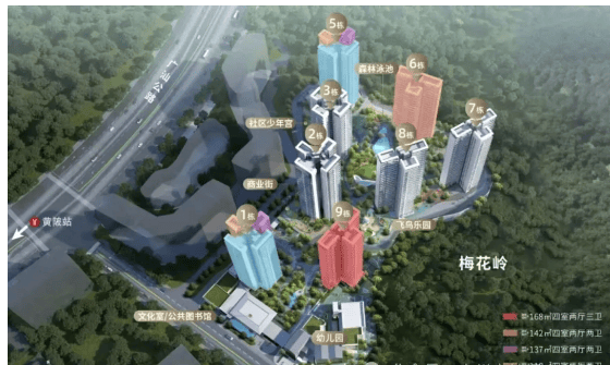 项目总占地面积约 4.3 万㎡,总建筑面积约 16 万㎡,容积率仅 2.8(低密度宜居),绿地率约 30%,规划 8 栋 20-23 层小高层住宅,总户数 806 户(可售住宅 635 户),圈层以纯改善为主。车位配比 1:2(1740 个车位),远超行业标准,停车无忧;物业公司为中铁建物业,物业费 3.2-4.5 元 /㎡/ 月,央企服务保障居住品质。建筑设计聚焦 “山景体验”:社区依托地势抬高 10 米,最大化保障视野与采光;得房率达 95%,3.1 米豪宅层高,空间通透感突出;紧邻 3 万方梅花岭,内部打造约 3.1 万㎡循山森氧生态园林,搭配图书馆、社区少年宫、居民健身场所等,尽显低密度山景社区的舒适质感。