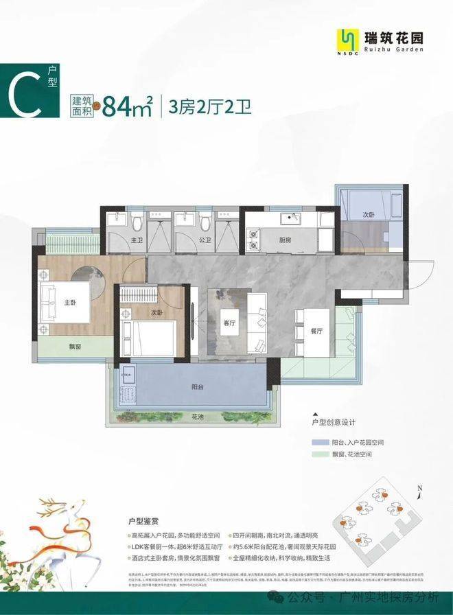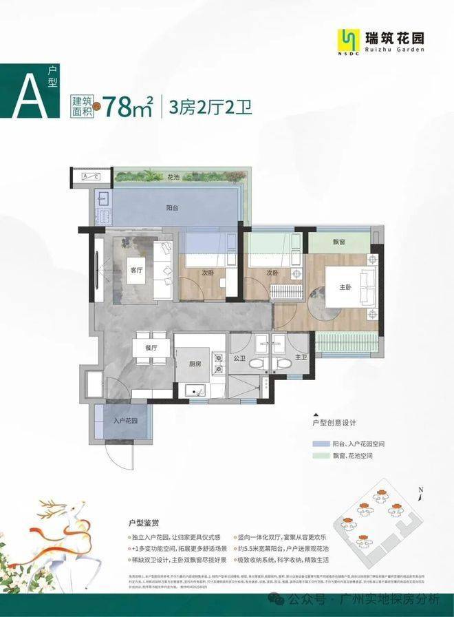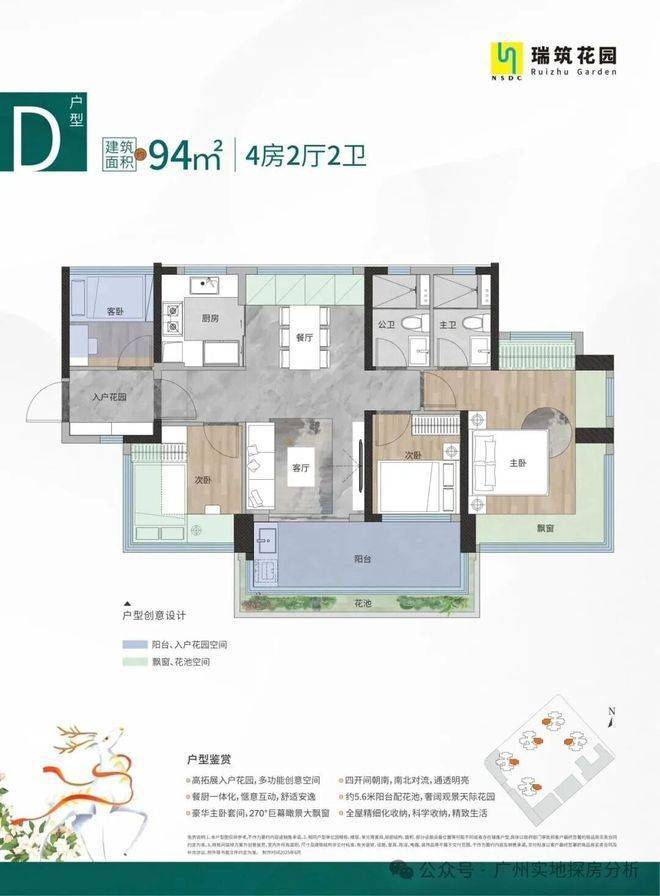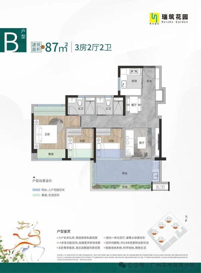 最让人上头的,是它的户型设计。77-95㎡这段面积,本该是刚需最容易妥协的地带,但瑞筑花园直接把“妥协”两个字撕掉扔进了沙湾水道。所有户型全部做到超100%使用率,78㎡能轻松做出三房两卫带5.5米横厅,87㎡四开间朝南带6米南向阳台,94㎡更是直接给出入户花园+270°转角飘窗+四房两卫的豪宅级配置。更绝的是部分户型北向就是一整片沙湾水道无遮挡江景,南向是自家园林,真正做到推窗见景、开门见园。