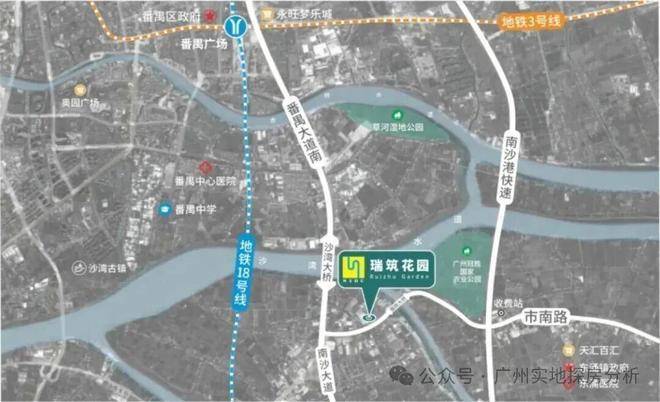 项目就藏在市南路与冠胜路交汇处,往北一桥就是番禺区政府,往南几分钟就是南沙自贸区核心,真正卡在广州最有潜力的价值凹陷区。这里不是传统意义上的南沙腹地,也不是高高在上的明珠湾,而是南沙与番禺无缝衔接的桥头堡,位置安静却又刚好踩在两条巨头的肩膀上。