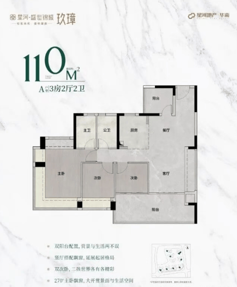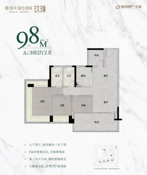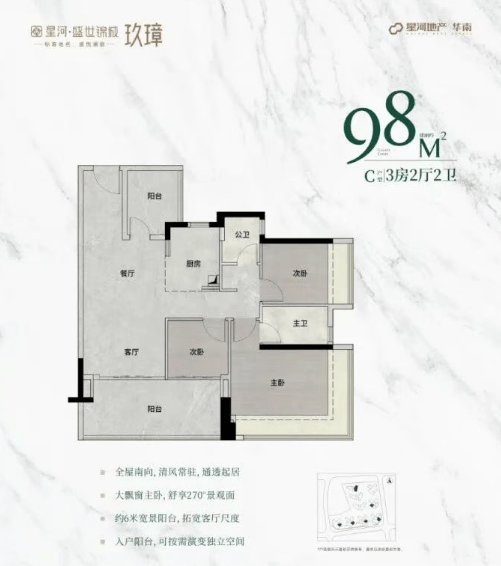 98㎡三至四房 主朝向朝南,主卧配备270°无柱飘窗,视野开阔,次卧和阳台尺度大幅增加,提供更加舒适的居住体验。