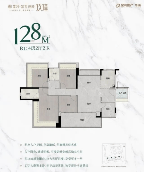 128㎡四房+1 独立入户花园设计,增加了鞋柜的置物面积,厨房、客餐厅和主卧尺度大幅提升,带来宽敞明亮的烹饪空间和豪华大气的主卧套房。