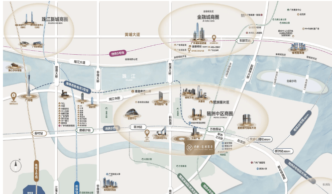 高端商业:周边高端商圈环绕,提升品质 距离项目约3公里内有琶洲CBD商圈、珠江新城商圈,汇聚众多高端品牌、奢侈品卖场、高端餐饮等,满足业主高端消费需求,同时彰显居住品质。