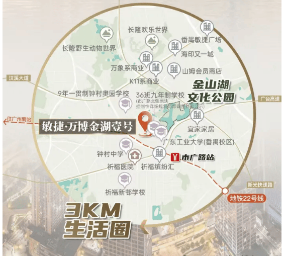 生态环境是项目一大亮点,400 米直达金山湖文化公园(番禺最大湖泊),日常休闲、散步、观景便捷,湖居景观稀缺,居住舒适度远超同板块非湖景楼盘。商业配套成熟,3 公里内有万博 CBD(天河城、万达广场等)、祈福缤纷世界、长隆商圈,购物、餐饮、娱乐选择丰富,无需等待规划兑现,入住即可享受成熟生活。医疗资源有保障,祈福医院(三甲)、番禺区第五人民医院(二级)近在周边,日常就医便捷,为家人健康保驾护航。