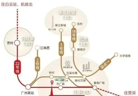 轨道交通优势显著,直线距离 22 号线市广路站仅 800 米,步行 10 分钟可达,2 站直达万博核心商圈、3 站到琶洲、4 站到珠江新城,22 号线时速 160 公里(全国最快地铁之一),还可一站换乘 18 号线,通达广州南站、白鹅潭、白云机场等核心区域。周边路网完善,紧邻市广路主干道,自驾便捷,3 公里内覆盖祈福、长隆、万博三大成熟商圈,无论是依赖地铁通勤(天河、海珠工作人群),还是日常购物出行,都十分便利,通勤与生活效率双高。