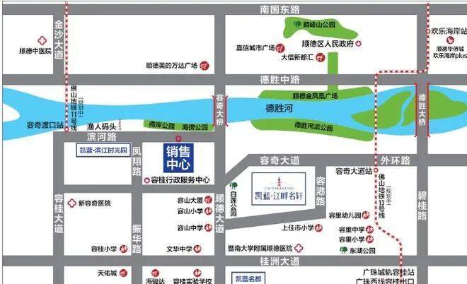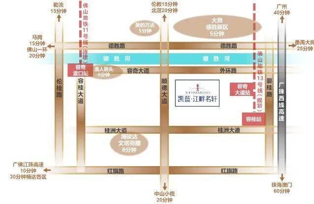 项目距离广珠西线高速容桂出口约2公里,日常自驾去广州南站或佛山新城都不算绕路。更关键的是,容桂本身路网成熟,“三纵三横”主干道基本覆盖全境——比如从凯蓝·江畔名轩出发,沿成业路往北接碧桂路,10分钟就能上广珠西线;往东走容奇大道,直达渔人码头、万达广场一带也只需十几分钟车程。虽然目前地铁尚未开通,但规划中的广佛地铁11号线和13号线均设有容桂站点,未来若落地,区域轨交便利性会再上一个台阶。对于每天需要跨城通勤的人来说,现有高速+主干道组合已能支撑起相对高效的出行节奏。