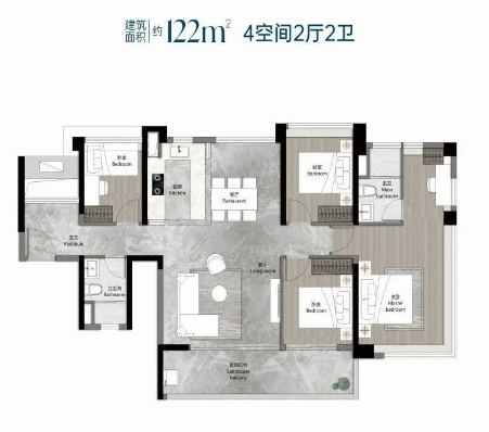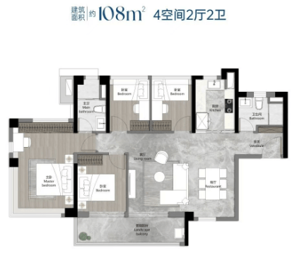108平方米四房两厅两卫:横厅设计,阳台开间达到5.95米,客餐厅进深约4.4米,拥有宽敞明亮的公共区域。