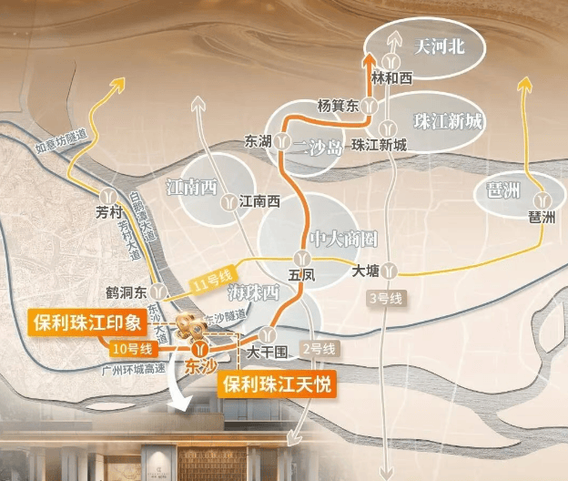 保利·珠江印象紧邻白鹅潭大道和东沙石岗隧道,距离10号线东沙站仅700米,步行即可到达。周边交通网络发达,包括环城高速、东新高速以及丫髻沙大桥,为居民提供便捷的城市出行条件。此外,规划中的水上巴士及港湾码头将进一步提升区域内的交通便利性。