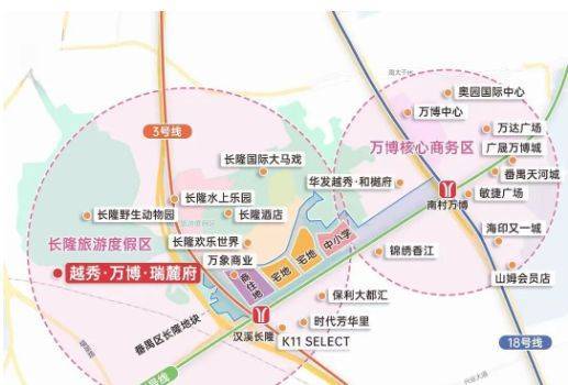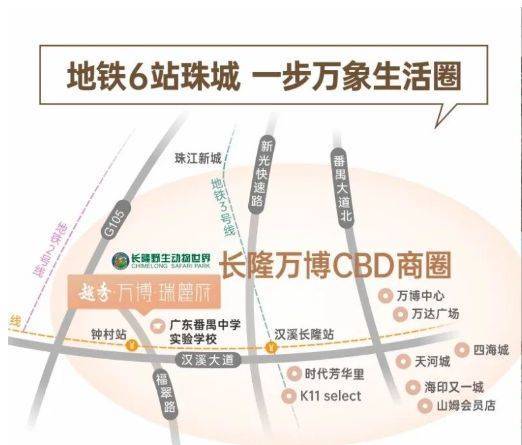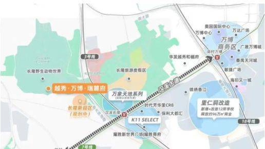 越秀瑞麓府位于番禺区长隆文旅区西南侧,项目北接长隆,西临钟顺路,可经汉溪大道、南大干线快速衔接万博CBD、琶洲与珠江新城等核心区域。从交通结构看,项目交通体系呈现“轨道+城市道路”双通道协同格局。
