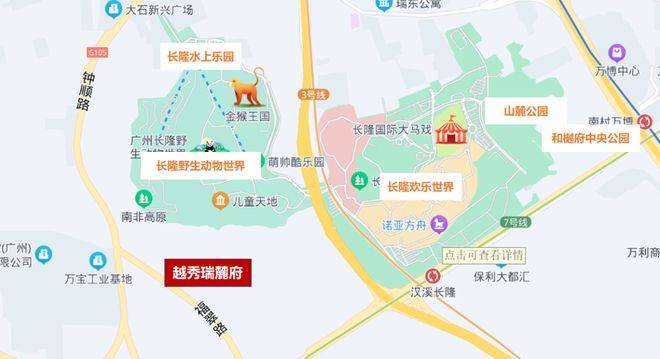 项目周边文旅资源具有全国辨识度。长隆野生动物世界、长隆欢乐世界及长隆水上乐园构成极具规模的主题文旅集群,具备旅游、研学、家庭体验与文娱属性。同时区域内存在飘峰山等自然生态资源,为户外徒步、生态体验提供多样公共环境。对于青少年成长、家庭周末休闲及跨城亲友接待具有场景优势。
