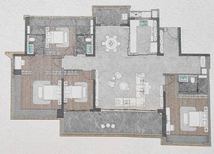 143㎡四房:布局与128㎡相似,但增加了南北双阳台的设计,提升了居住舒适度。
