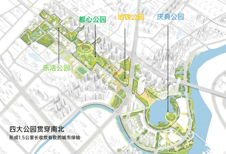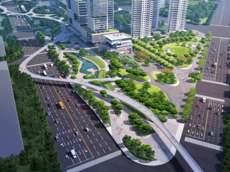 空中立体云廊连接商业综合体、地标写字楼及三馆一湖,让居民在步行范围内享受丰富的城市景观与活动。