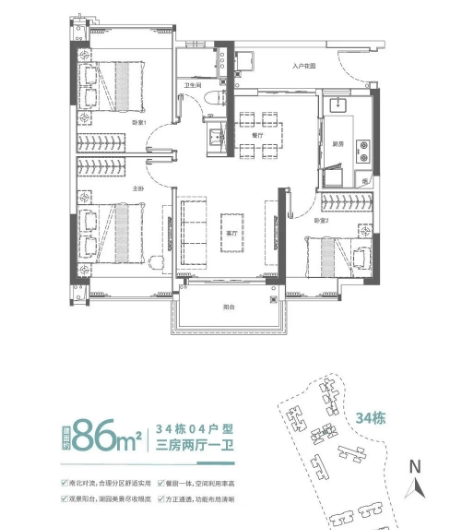 项目 “观灏” 组团在售户型覆盖 86-162㎡二至五房,适配刚需至改善全周期需求,户型设计以 “高实用率 + 景观适配” 为核心。86㎡户型分为南北通透与精致水景两个版本:前者南北对流,客厅连通南向阳台,采光通风俱佳;后者为经典竖厅设计,餐客一体延伸至阳台,可直面水景,适合年轻刚需家庭。