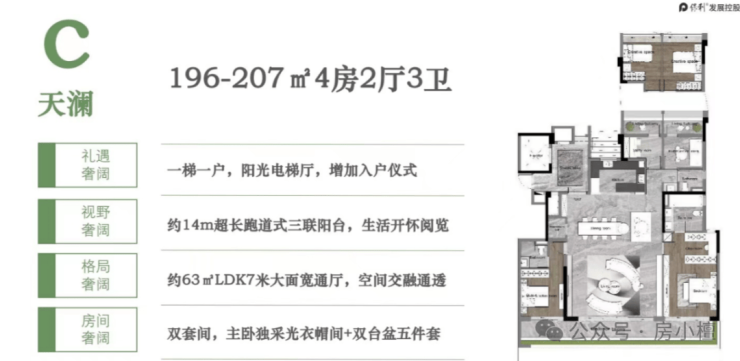 项目建面约 196-207㎡四房三卫大平层产品,是为城市高净值人群打造的终极改善型奢居产品。该户型采用独梯独户设计,打造专属入户前厅,营造满满的归家仪式感与私密性。户型打造约 14 米 IMAX 级全景观景阳台,可奢享一线滨水景观与海珠湿地公园生态盛景,实现 270 度全景视野。户型采用双主卧套房设计,其中超大主套房面积超 30㎡,配备独立衣帽间、独立卫浴与全景飘窗,尽显居住的奢华感与舒适度。户型同时打造 7 米超宽奢会客厅,可全面满足家庭社交、商务接待、亲友聚会等多元场景需求,完美匹配城市高净值人群的居住标准与生活格调。