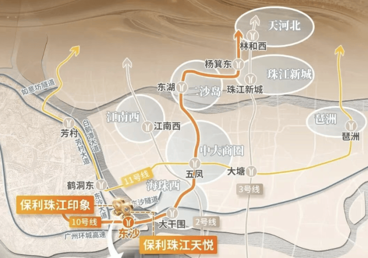 地铁:距离在建的地铁10号线东沙站仅700米,2025年底通车后4站直达中山大学站,6站至杨箕站,无缝换乘1、3、5号线,通勤珠江新城仅需25分钟;1.3公里外的地铁11号线环线已运营,3站到琶洲。