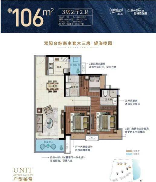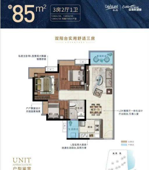 85㎡三房:三开间布局,主卧朝南,阳台可观园景或海景,适合年轻家庭;
