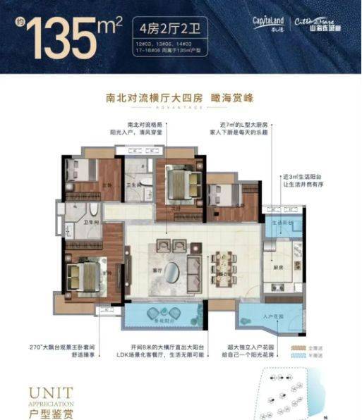 130-135㎡四至五房:横厅超6米,连接双阳台,主卧套房配置,南北通透;