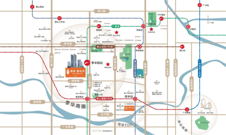 项目坐落于禅城核心区域,占据城市黄金枢纽位置。毗邻佛山大道、季华五路、汾江路等城市主干道,交通网络四通八达。项目距离广佛线季华园站仅约200米,坐享2号线、4号线(在建中)便捷轨道交通,形成2站到祖庙,8站到千灯湖,10站到广州南的快速通勤体系。这种双地铁上盖的超级物业属性,使项目成为真正的地铁物业标杆。项目所处的越秀区北京路商圈,是佛山传统的商业核心区,与北京路、天河城等商业IP形成稀缺资产组合。6/2号线双地铁交汇,不仅带来便捷的出行体验,更赋予项目强大的增值潜力。周边3公里范围内,城市核心配套一应俱全,从商业购物到文化娱乐,从教育医疗到生态休闲,构建起全方位的生活服务体系。这种"地铁上盖+核心商圈+完善配套"的多重优势,使粤海壹桂府成为禅桂中心区难得一遇的中心综合体。粤海壹桂府提供购房咨询联系方式(已认证)400-622-0051