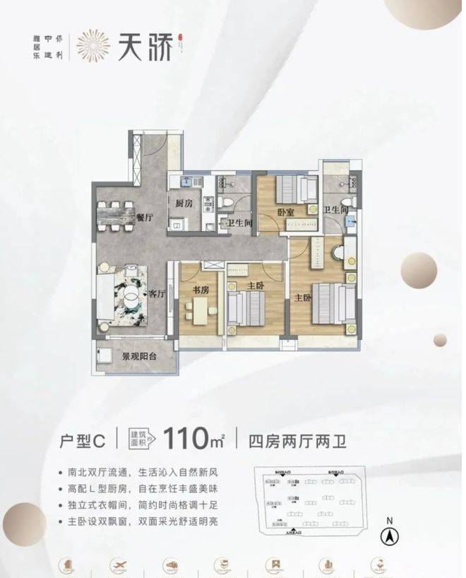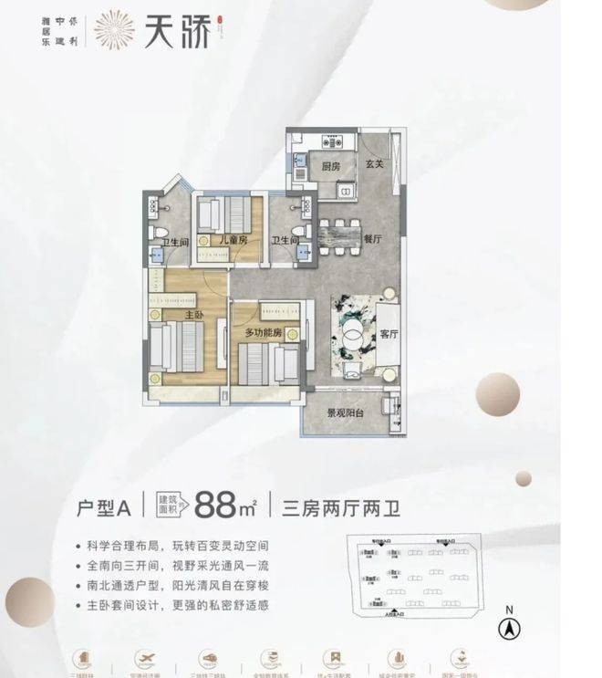 户型设计主打实用。主力户型 88 - 110㎡的三至四房,方正实用,部分户型带景观阳台或飘窗,空间布局合理。不过得房率因为板楼设计和风雨连廊计入公摊,部分户型相对低一些,像 110㎡户型公摊较大。但整体上,户型设计能满足不同家庭需求,全南向和户户南北通透的设计,采光通风好,居住起来还是很舒适的。