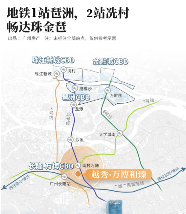 越秀万博和臻距离18号线南村万博站约800米 三条地铁线路2号线7号线18号线交汇 乘地铁1站可达琶洲 2站到冼村 一步可达广州南站 高速交通便利 华快和新光快速与珠城、琶洲及金融城无缝连接 大湾区出行快速便捷 通勤效率高 项目区位兼具城市CBD繁华和低密墅景住宅的优势 即享核心商务圈便利 又免受主干道噪音干扰 周边公共交通便捷,可满足年轻上班族及家庭日常通勤 适合长远投资及自住需求 同时交通优势也为未来商业及生活配套落地提供了有力支撑 越秀·万博和臻 售楼处24小时电话400-6557-087 (售楼部认证),预约专属顾问一对一服务,尊享内部折扣!