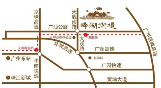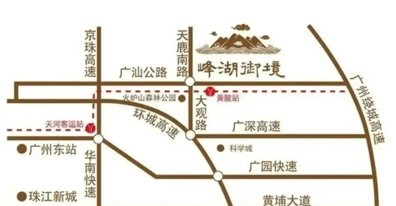 华标·峰湖御境坐落于广州市黄埔区,具体位于科学城的核心区域。该项目背靠880公顷的天鹿湖森林公园,环抱乌涌河,四周被四大生态公园环绕,拥有得天独厚的自然景观资源。同时,项目距离珠江新城仅约30分钟车程,既享受了都市的便捷,又不失山居的宁静。