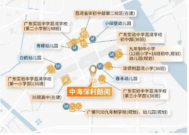 答:中海保利朗阅周边拥有从幼儿园到高中的一站式全龄教育体系。项目一路之隔就是已于 2022 年 9 月开学的广东省一级学校广东实验中学荔湾学校第三小学部,距离仅约 50 米。周边还有省实一小、省实二小、华师附小等优质小学,以及广东实验中学荔湾学校等知名中学。项目自身配建的 36 班广东省实验初中预计 2025 年竣工投入使用。整个广钢新城片区规划建设 32 所学校,教育资源非常丰富。