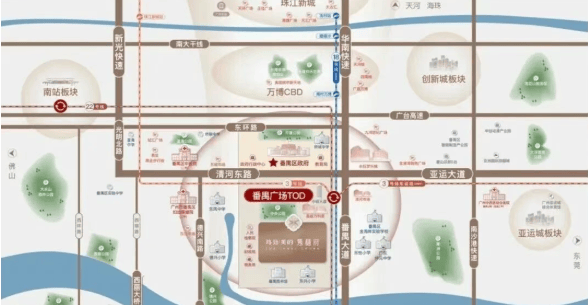 项目距离地铁3号线番禺广场站约800–900米,步行约10–12分钟,周边汇聚3号线、18号线、22号线及规划中的17号线四条轨道线路,构成番禺最强交通节点。通过18号线,18分钟直达珠江新城;22号线快速连接南沙;3号线贯通天河、海珠;未来17号线将进一步加密区域路网。自驾方面,项目紧邻番禺大道、南沙港快速等城市主干道,30分钟内可通达万博CBD、琶洲、珠江新城等核心商务区,出行效率极高。作为番禺传统政务与商业中心,该板块路网成熟、通勤便利,是少有的“轨道+干道”双优区域。
