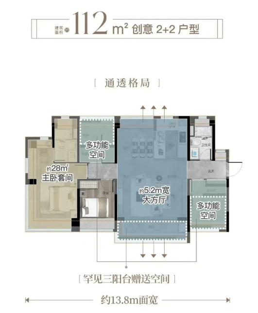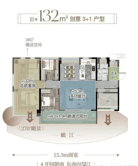 112㎡户型:5.2米方厅+三阳台赠送,270°观景飘窗,拓展瞰江视野;