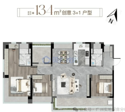 134㎡户型:8.2米×1.9米超大阳台,33㎡主卧套房,5.3米复合厅配270°飘窗,奢阔尺度媲美豪宅。 虽为品牌精装交付,未详述具体建材品牌,但依托美的置业“智慧精装”体系与路劲豪宅基因,细节与品质值得期待。