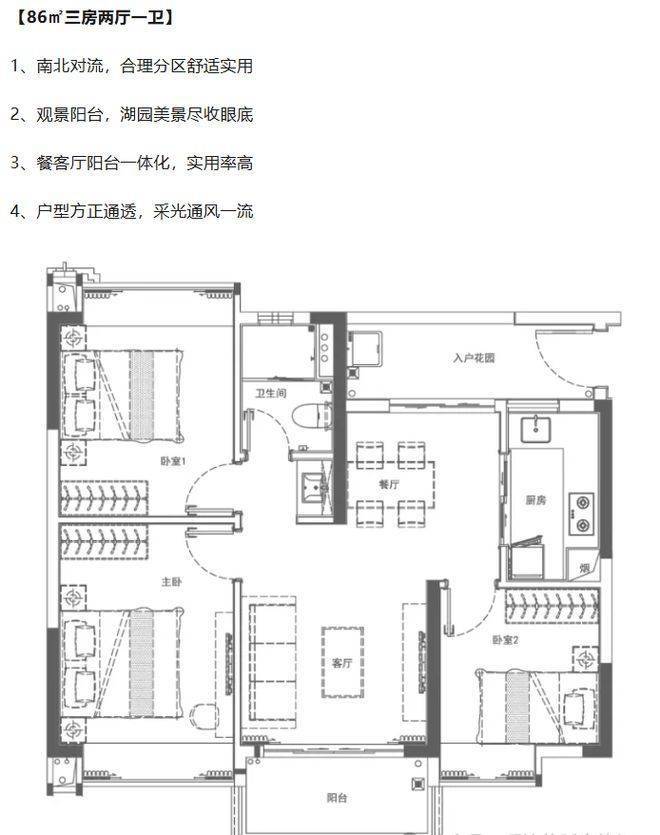 户型设计精巧,涵盖 86 - 100㎡悦景三房,另有 74 - 162㎡湖景二至五房可选。以 86㎡三房两厅一卫户型为例,南北对流,合理分区,舒适实用;观景阳台可将湖园美景尽收眼底;餐客厅阳台一体化,实用率高;户型方正通透,采光通风一流。86㎡三房两厅两卫户型,布局合理,视野开阔采光优越;带主套设计,畅享舒适生活;L 型厨房,洗切煮炒一气呵成;宽景景观阳台,俯瞰珍稀水景。96㎡三房两厅两卫户型,超宽楼距,视野开阔采光优越;带主套设计,享受舒适生活;餐客厅一体化,连通观景阳台;滨水景观三房,户型方正实用。100㎡三房两厅两卫户型,三开间朝南,采光通透舒适实用;宽奢带主套设计,瞰景大三房;客餐厅一体,动线布局科学合理;7.3 米超宽阳台,私享尊崇生活。各个户型都方正实用,动静分区合理,能满足不同家庭结构的需求。