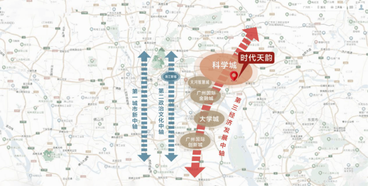 时代天韵位于整个广州主城区飞速发展的一个板块科学城板块,它是整个粤港澳大湾区发展最前沿的一个位置。