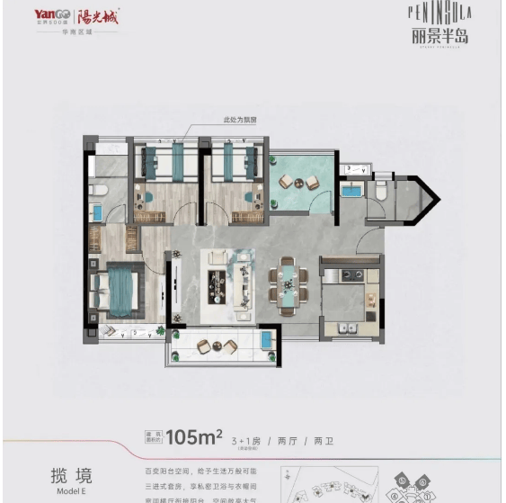 105㎡四房:四开间朝南,动静分区合理,适合二胎家庭或三代同堂,兼具功能性与舒适度。
