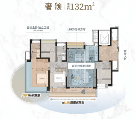 132㎡四房两厅两卫:约8.3米跑道式景观阳台,IMAX级景观环绕,景观家政阳台双分离。
