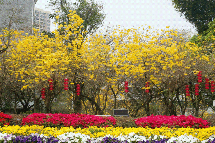社区内打造30% 绿化率复合型岭南园林,种植黄花风铃木、异木棉、香樟、桂花等四季树种,搭配岭南特色景墙、水景、亭台、步道,做到三季有花、四季有景。