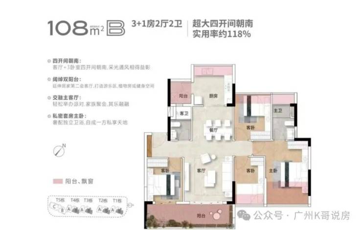 (二)建面约 108㎡ 四房 2 厅 2 卫 —— 主流改善爆款・四开间朝南