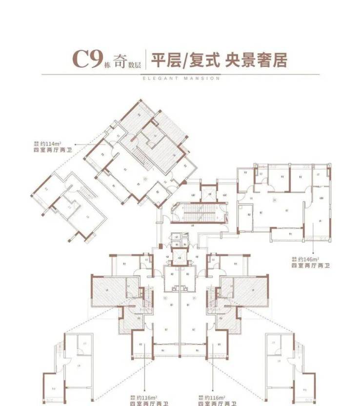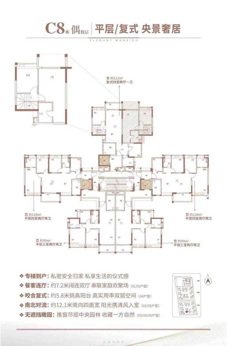 臻裕府 C9栋:专梯到户的优质生活,专享超大候梯厅,咬合复式设计,约5.8米挑高阳台,超高使用率,推窗近享社区中轴园林美景。