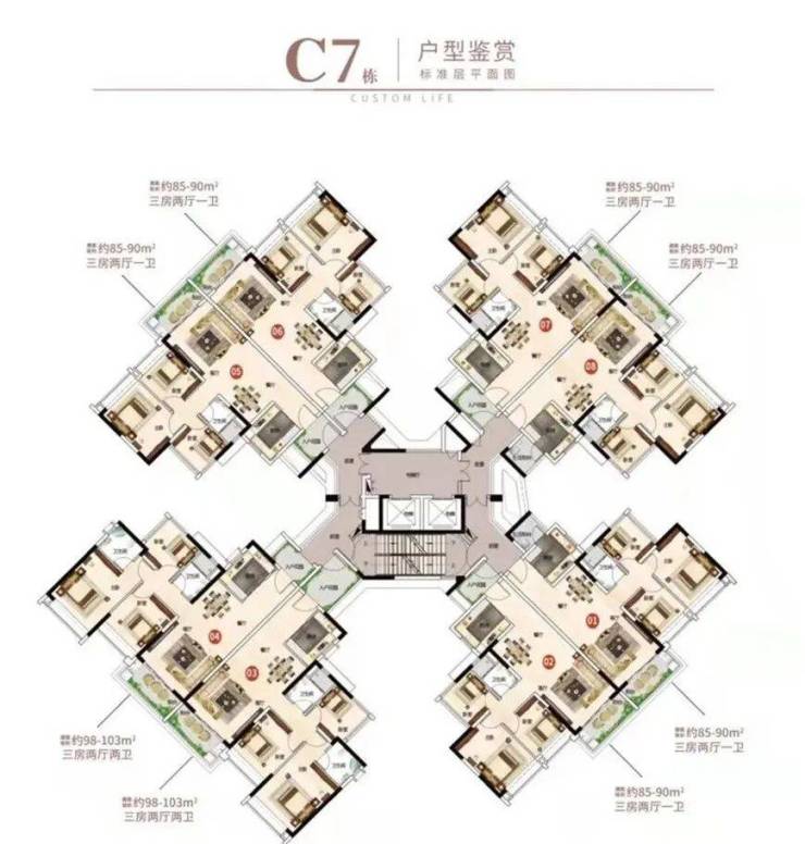 C7栋:方正实用的三房户型,动静分区合理;主卧套间设计,享有三开间;入户花园增添精致感。